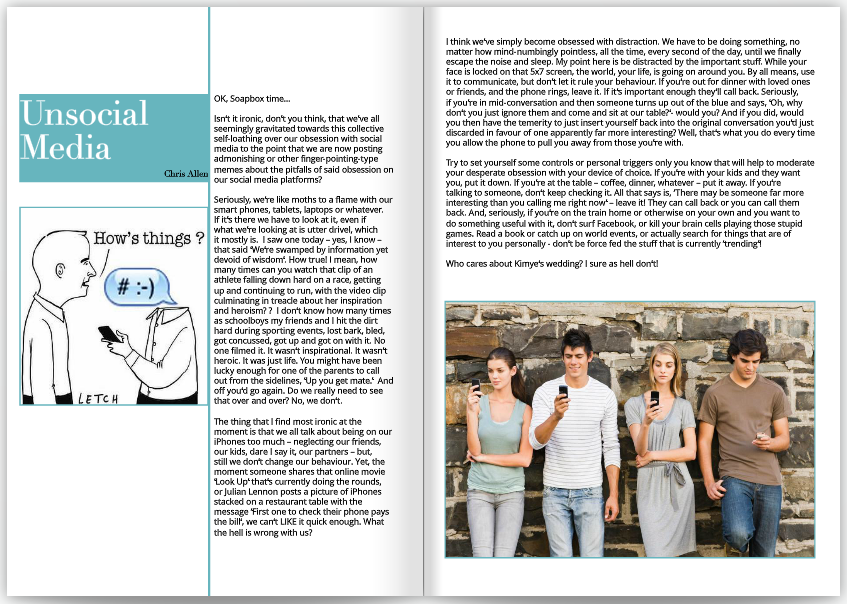 GLOSS Magazine: Unsocial Media Column on Unsocial Media as featured in LBD Group's Magazine June issue - click on the image below to read! Guest Article, Magazine ArticleChris Allen Author20 June 2014GLOSS Magazine, Little Black Dress Group, LBD Group, Social Media, Unsocial Media, Connection, Family, FriendsComment Facebook0 Twitter LinkedIn0 Tumblr 0 Likes
